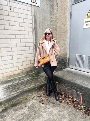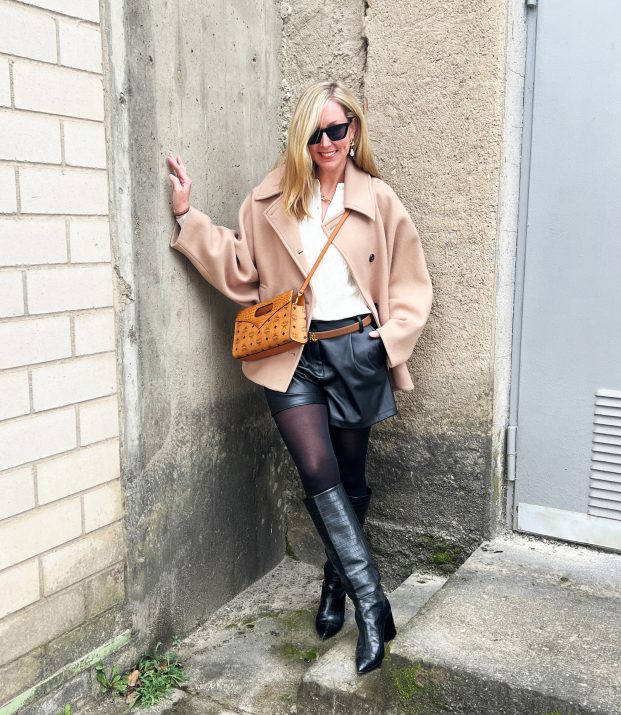Hallo Ihr Lieben, manche Looks erzählen eine Geschichte, ohne laut zu sein. Genau so ein Outfit zeigt sich auf diesem Bild: urban, selbstbewusst und mühelos stilvoll. Die Kombination aus klaren Linien, soften Naturtönen und markanten Leder-Elementen steht exemplarisch für einen der wichtigsten Trends der letzten Saisons – modernes Understatement mit Luxus-Appeal. Im Mittelpunkt steht die oversized geschnittene Manteljacke in einem warmen Camel-Ton. Diese Farbe ist längst ein Klassiker und wird regelmäßig von Magazinen wie Vogue als unverzichtbares Essential hervorgehoben. Die Manteljacke wirkt durch seinen minimalistischen Schnitt besonders hochwertig und lässt sich vielseitig stylen – von casual bis elegant. Darunter sorgt eine helle Bluse für Leichtigkeit und Kontrast. Der cleane Look wird bewusst nicht überladen, sondern lebt von der Qualität der Materialien. Genau dieser Ansatz wird auch von Harper’s Bazaar propagiert, wo reduzierte Silhouetten und zeitlose Basics immer wieder im Fokus stehen. Ein echtes Statement setzt die schwarze Leder-Shorts. Leder ist nicht mehr nur Rock’n’Roll, sondern längst salonfähig – ob im Büro-Look oder im Streetstyle. Kombiniert mit einer transparenten Strumpfhose entsteht ein spannendes Spiel zwischen Stärke und Eleganz. Deshalb zählt Leder aktuell zu den stärksten Key-Pieces der Saison. Die kniehohen schwarzen Stiefel strecken die Silhouette und verleihen dem Outfit eine selbstbewusste Attitüde. Sie sind ein perfektes Beispiel dafür, wie Accessoires einen Look definieren können. Who What Wear beschreibt genau diesen Effekt als „Power Styling durch Footwear“. Ein besonderes Highlight ist die Crossbody-Bag von MCM in warmem Cognac-Ton. Sie bringt nicht nur Farbe ins Spiel, sondern auch Struktur und Funktionalität. Taschen als stilprägendes Element werden regelmäßig bei FashionUnited analysiert, besonders im Kontext von Streetstyle und Luxusmode. Abgerundet wird der Look durch eine große Sonnenbrille – ein zeitloses Accessoire, das sofort Coolness vermittelt. Sie schützt nicht nur vor Sonne, sondern auch vor modischen Kompromissen. Dieser Look zeigt, wie moderne Mode funktioniert: klare Formen, hochwertige Materialien und ein Gespür für Proportionen. Er ist tragbar, wandelbar und dennoch absolut fashion-forward. Ein Outfit, das beweist, dass Stil nicht laut sein muss – sondern einfach stimmig.